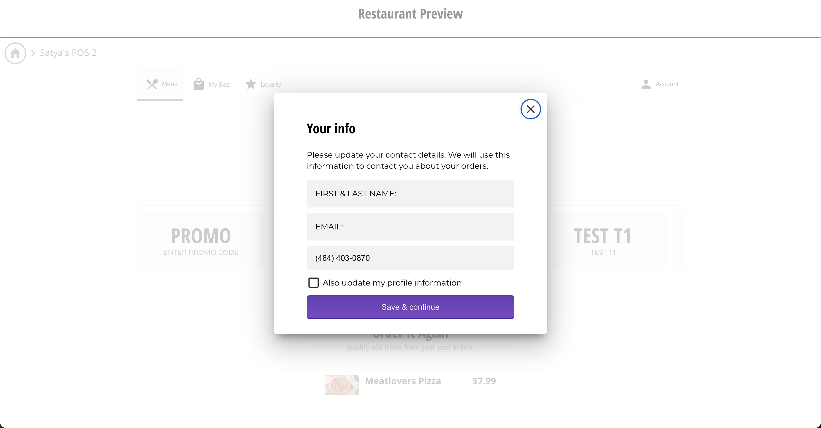 - If the user has already merged their phone number with their existing Zuppler account before ordering on the kiosk, they will see and retain all their loyalty points in one place.